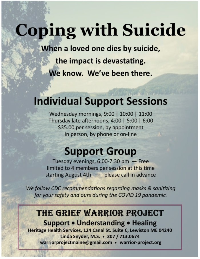 And, beginning Tuesday, August 4th at 6:00 pm, The Grief Warrior’s survivors of suicide loss support group will begin again, and now will meet at the offices of Heritage Health Services, 124 Canal Street, Suite C, in Lewiston. Because of the COVID 19 pandemic, the group is limited to 4 participants in any session. Please call in advance to be sure there is space available. The support group is free of charge.