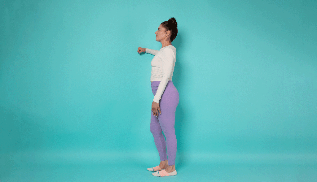 Step 2: Lift your heels off the ground and stand on your toes to engage your calf muscles. Start with both feet on the ground. As you get stronger, try keeping only one foot on the ground at a time.